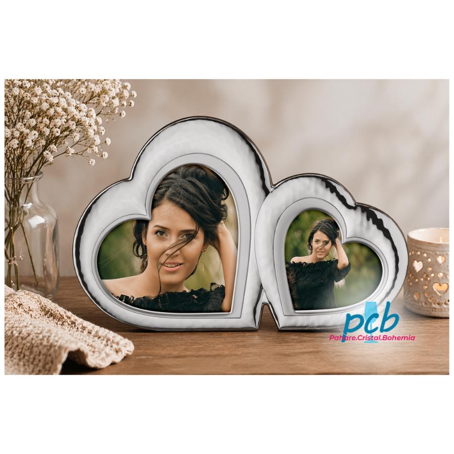 Rama foto dubla, in forma de inima, se remarca printr-un design delicat si rafinat, fiind conceputa pentru a evidentia doua fotografii dragi. Perfecta pentru pastrarea momentelor speciale, adauga eleganta oricarui decor si constituie o idee de cadou inspirata si de efect.