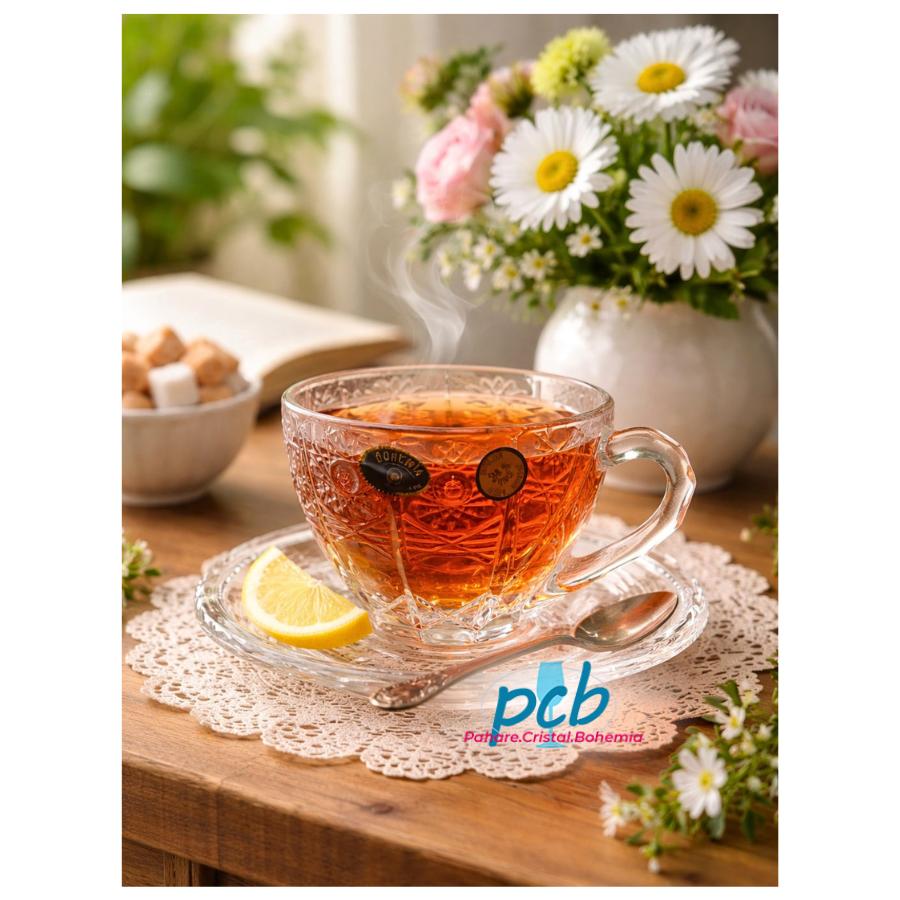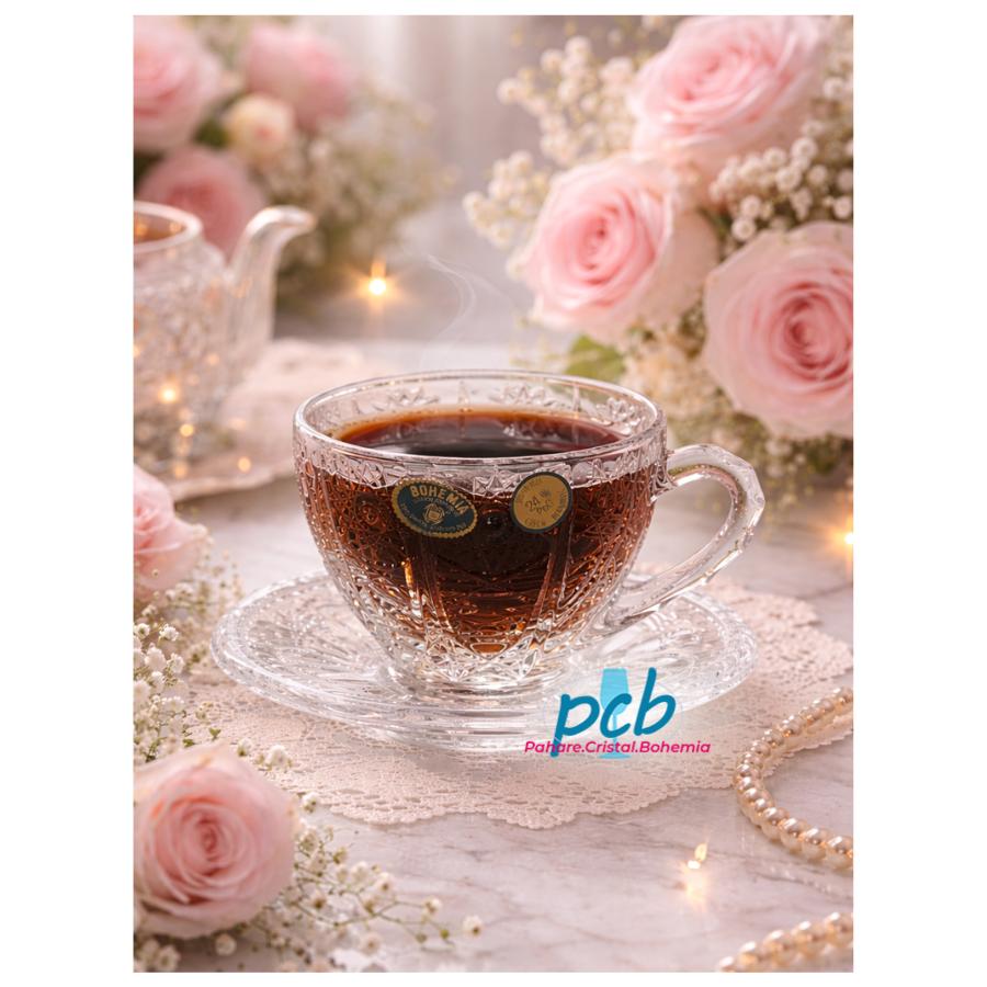 Setul contine 6 cesti din cristal si 6 farfurii din cristal